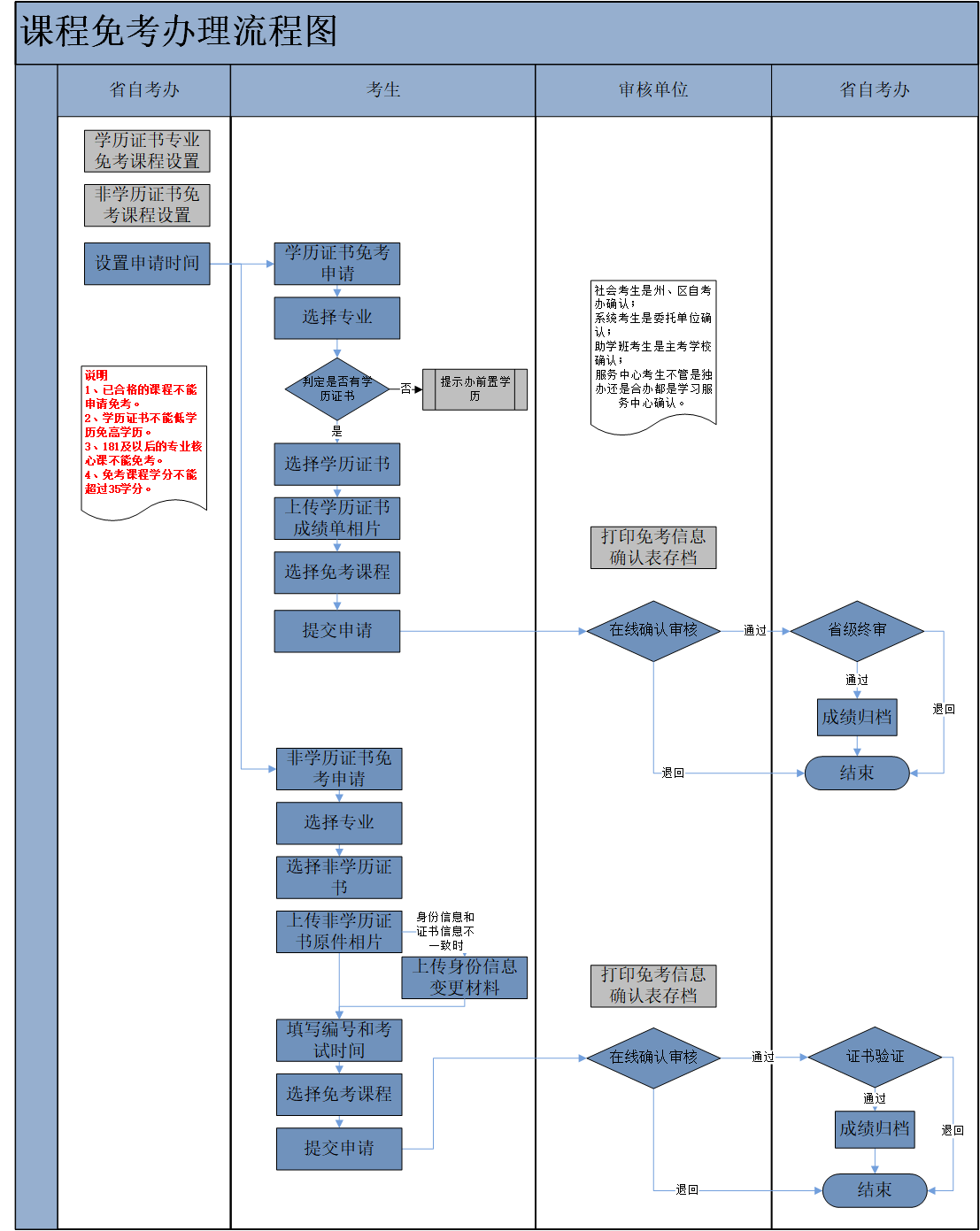 省教育考试院自考办根据考生的课程免考申请、确认结果以及考生上传的材料对考生申请的课程免考进行确认。免考确认通过的,课程免考结果直接归档进入成绩库;确认不通过的,省教育考试院自考办予以退回并说明退回原因。考生可在规定时间自行登录“考生服务平台”查询课程免考结果。